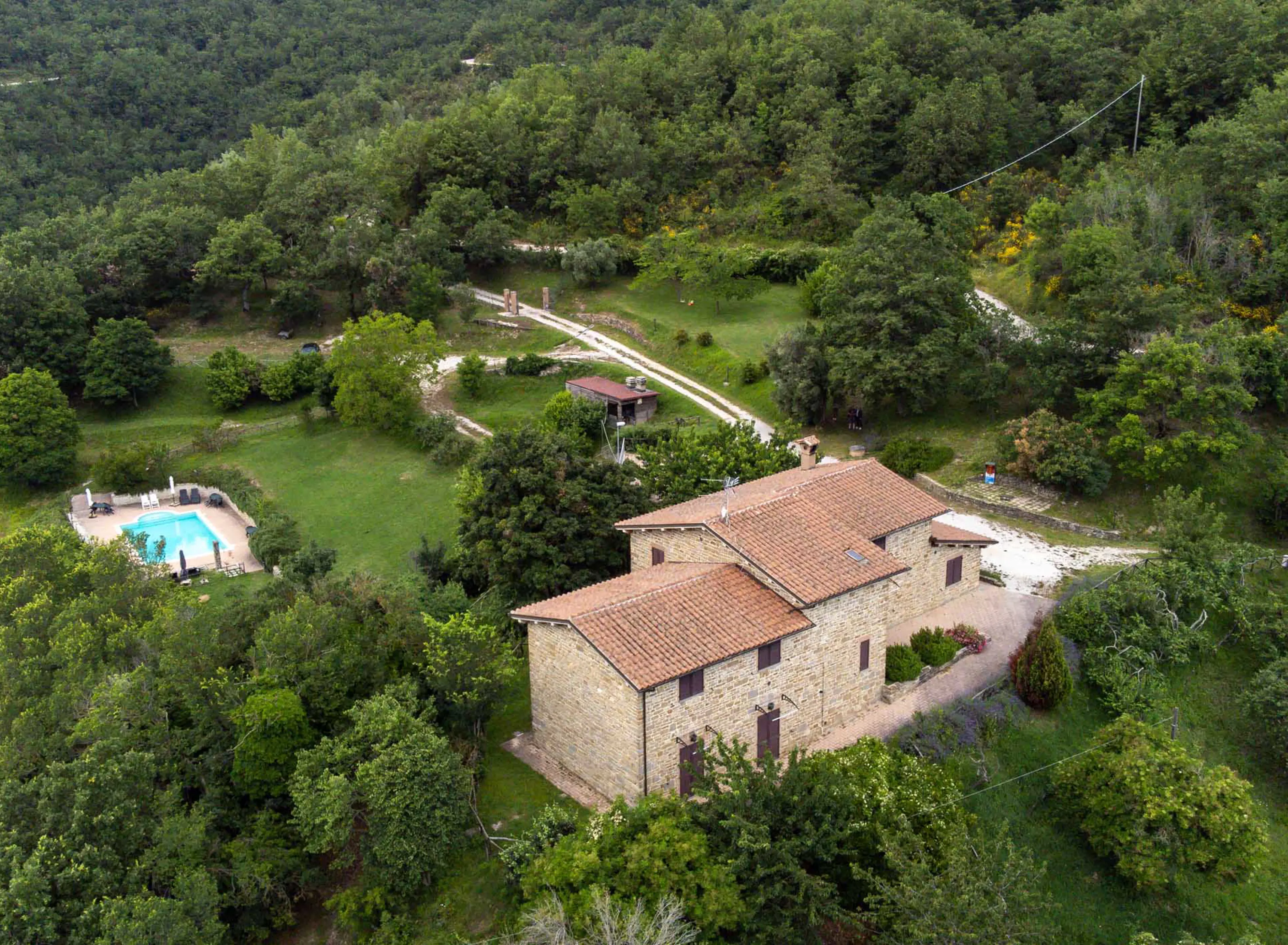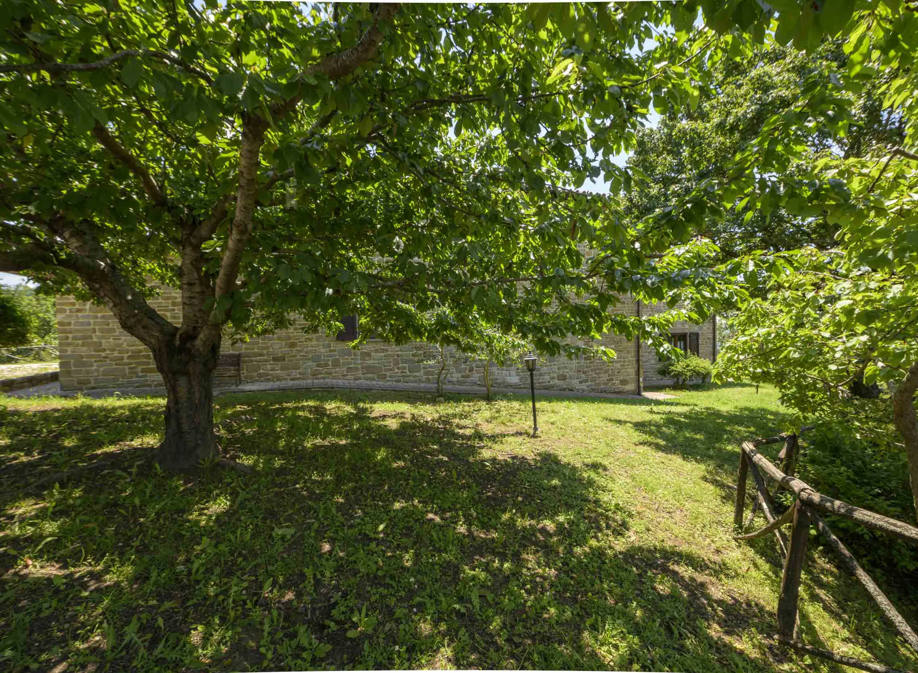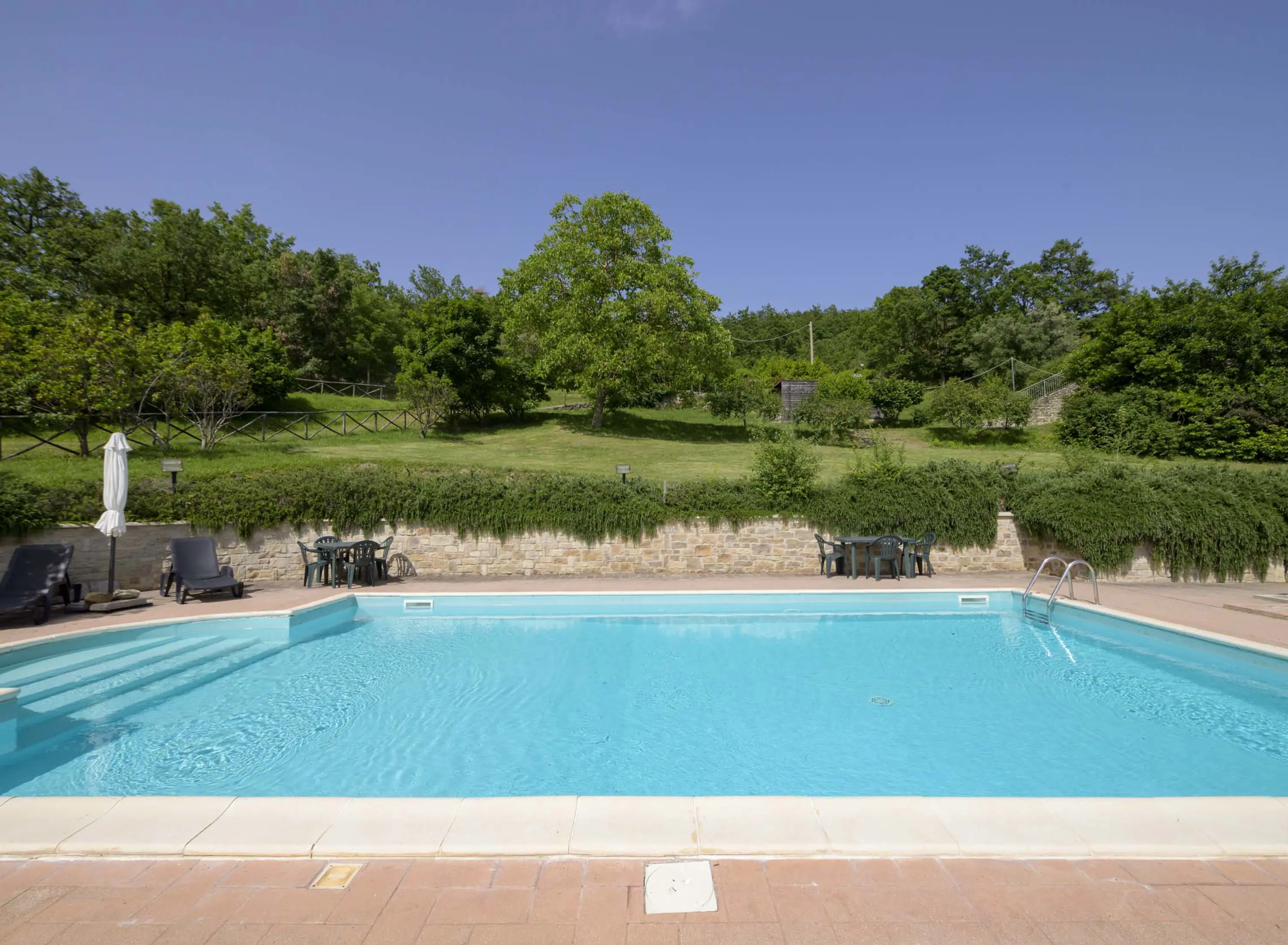 Esternamente troviamo un bellissimo ed ombreggiato giardino dove poter vivere momenti di assoluto relax ed una grande piscina con una bellissima vista panoramica sulla vallata eugubina. A rendere questa struttura agrituristica una vera oasi di pace e tranquillità oltre al bellissimo verde e curato parco circostante, troviamo un laghetto sorgivo incastonato tra una dolce collina.